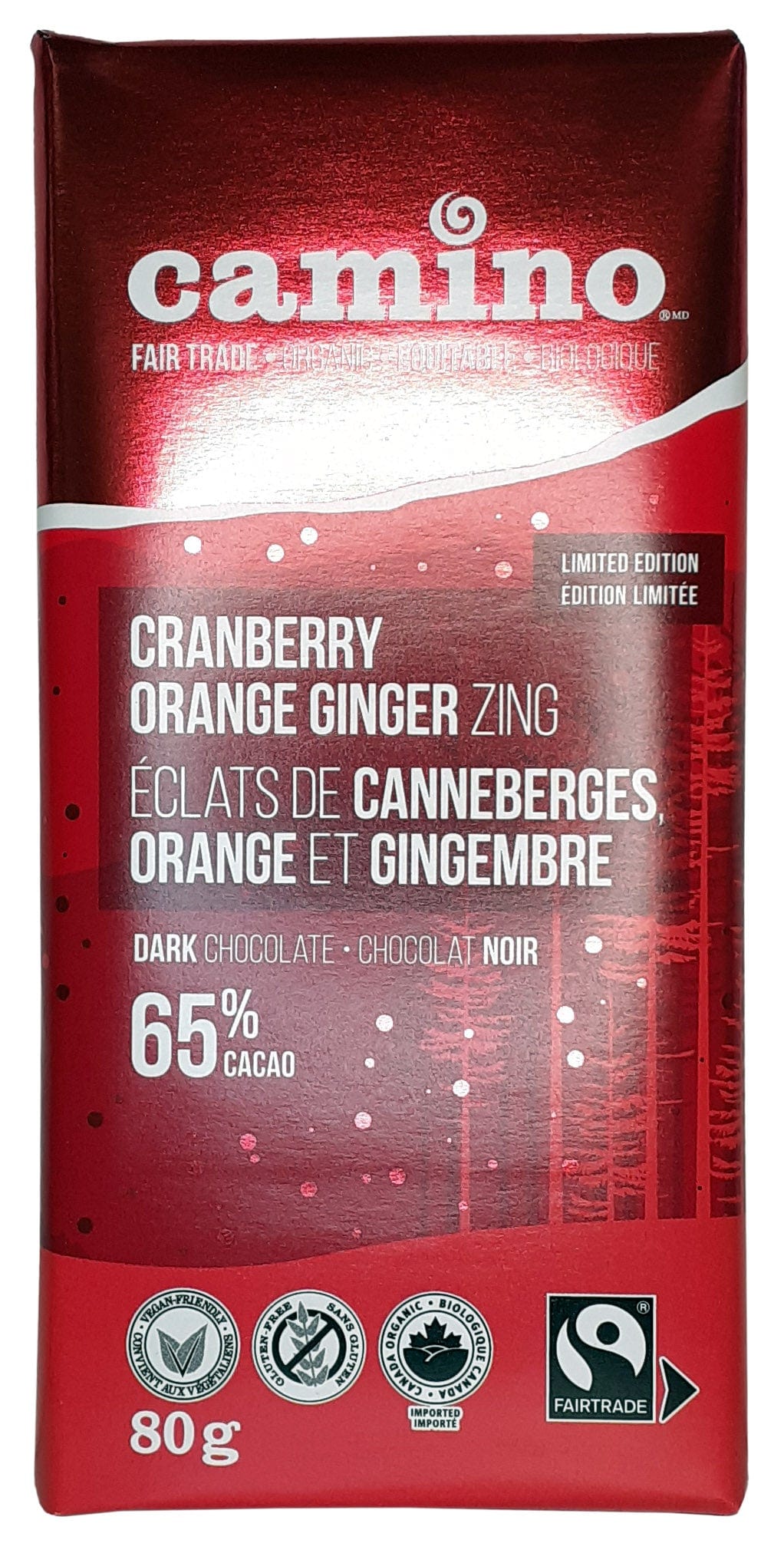 Ingredients: Organic cocoa paste, organic sugars (organic brown cane sugar, organic whole cane sugar), organic cocoa butter, organic candied orange peels (organic orange peels, organic sugars [organic sugar, organic icing sugar , organic glucose syrup]), organic candied ginger (organic ginger, organic cane sugar), organic cranberries, organic ground vanilla pods.
