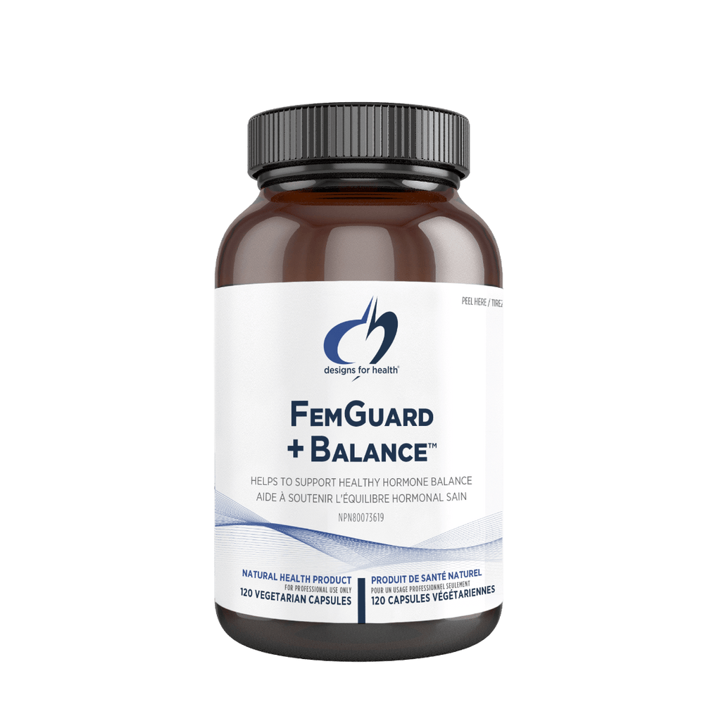 Description : FemGuard + Balance™ cible l'équilibre hormonal féminin en apportant de l'extrait de gattilier et de l'actée à grappes noires, ainsi que du diindolylméthane (DIM) et de la chrysine pour favoriser un métabolisme normal des œstrogènes. Le D-glucarate de calcium peut favoriser l'élimination des œstrogènes en excès. L'extrait de graines de brocoli standardisé et la poudre de graines de moutarde fournissent respectivement du glucosinolate de sulforaphane et de la myrosinase, des enzymes naturellement présents, pour favoriser une conversion maximale en sulforaphane, un composé bénéfique qui contribue aux voies de détoxification normales et au métabolisme des œstrogènes. Les vitamines B6, B12 et l'acide folique favorisent la différenciation cellulaire. Le magnésium et le calcium contribuent à la santé osseuse et hormonale. Le trans-resvératrol et l'EGCG, issus du thé vert décaféiné, sont des phytonutriments qui contribuent au statut antioxydant global.