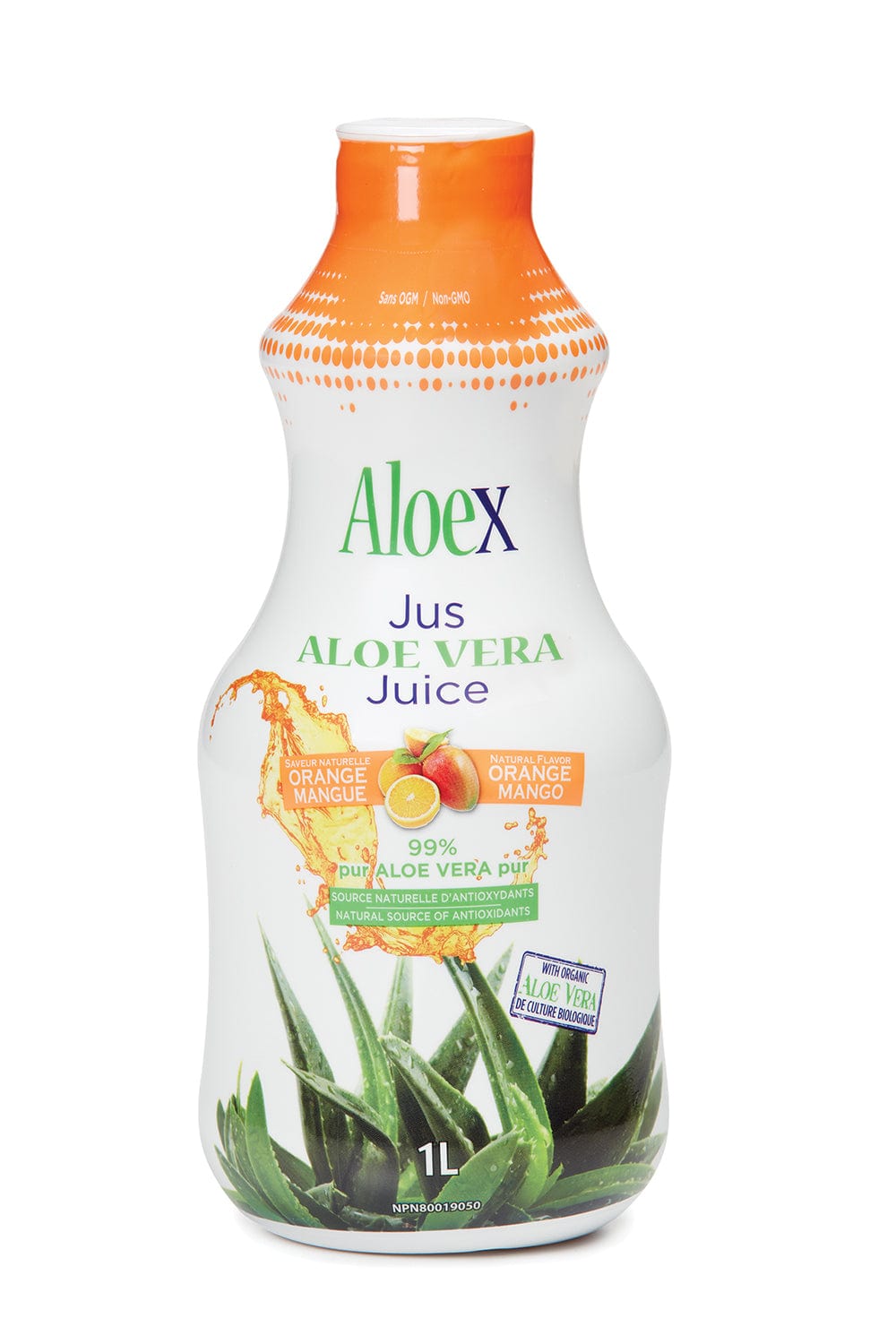Ingredients: 2 tablespoons (2 X 15 mL) contains 27.8 g of Aloe Vera from the gel of the leaves of Aloe Vera L. natural orange flavor, natural mango flavor, citric acid, potassium sorbate, sodium benzoate, ascorbic acid.