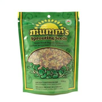 Description: Check out this ancient eastern sprouting mix from Mumm's Sprouting Seeds. Organically grown, these seeds have been grown using environmentally responsible farming methods, without the use of GMOs or chemical fertilizers. Contains: fenugreek, lentils, kamut and azuki.