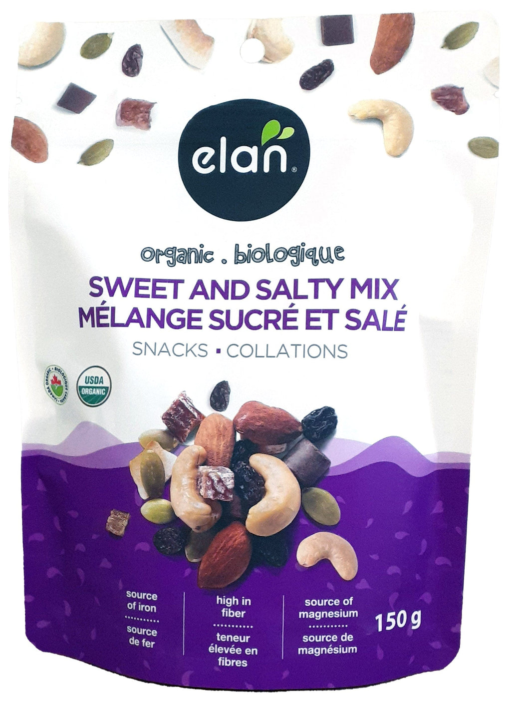 Description: Elan Sweet and Salty Mix is a delicious treat made with dark chocolate, dates, raisins, coconut chips, pumpkin seeds, organic cashews and lightly roasted and salted almonds. perfection. This rich combination of organic nuts, fruits and chocolate will satisfy the most demanding nibblers whether at home or on the go.