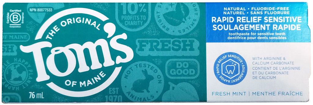 Description: Instant sensitivity relief, free of fluoride, no artificial flavors or colors, no preservatives, and not tested on animals. Tom's of Maine Rapid Relief Sensitive Toothpaste uses a powerful combination of arginine and calcium carbonate (both derived from natural sources) to seal the pathways leading to nerves in sensitive teeth and help stop pain. Our patented, clinically proven formula provides relief in 60 seconds and long-lasting protection with continued use. This patented formula provides fast relief when applied directly to the sensitive tooth with the fingertip and gently massaged in for 1 minute.