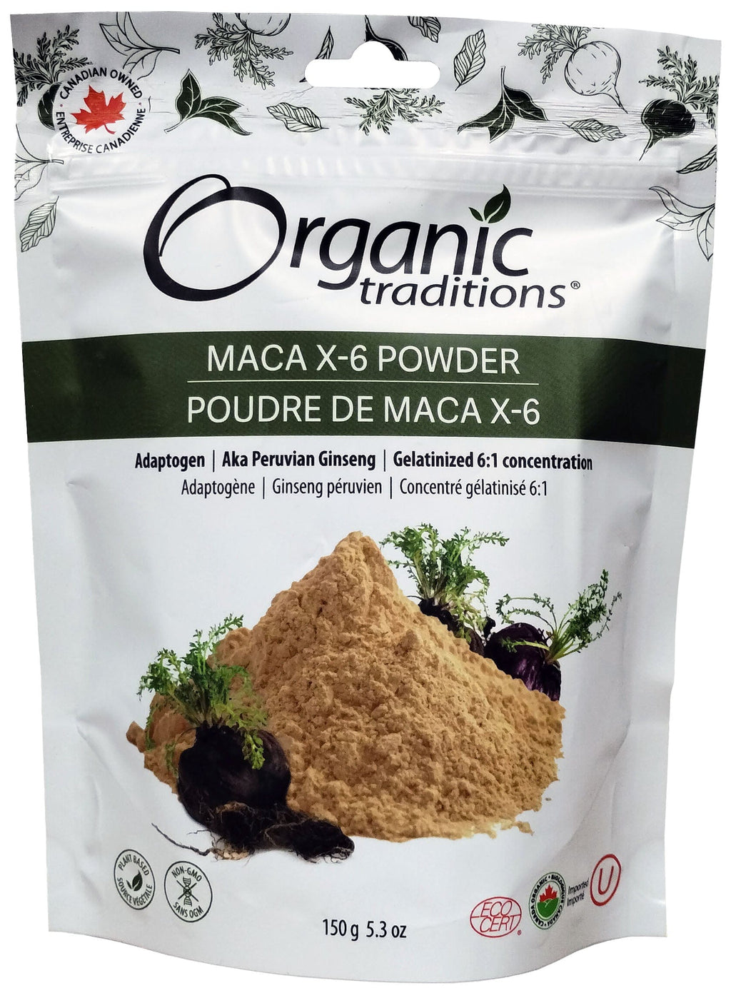 Description: 6 pounds of fresh maca root yields 1 pound of Maca X-6 powder. A delicious energizing adaptogen. Dietary supplement. Ingredients: Organic yellow maca, organic red-violet maca and organic black maca. Use: Add to water, coconut water, juice, smoothies, tonics, yogurt, berries, desserts and more.