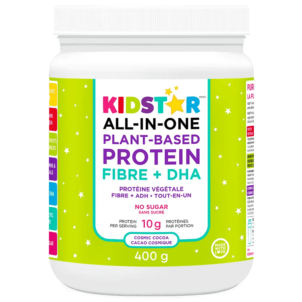 Description: Our all-in-one plant-based Cosmic Cacao Protein is a specially formulated protein powder containing 10 grams of protein per serving, essential vitamins and minerals, prebiotic fiber and DHA, and contains organic fruits and vegetables. It's a great way to meet children's growing daily protein needs, especially for picky eaters and those on a vegan or vegetarian diet.