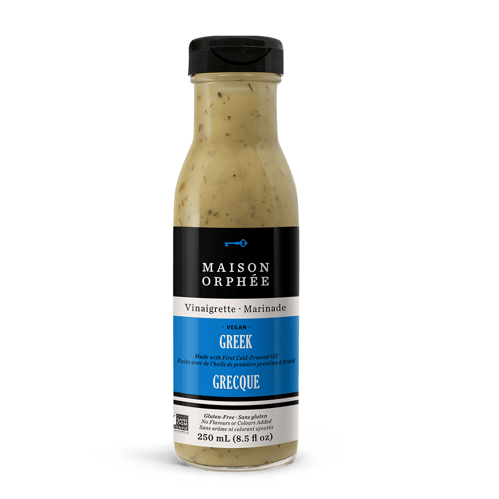 Description: Greek vinaigrette, a classic, redefines "à la" Maison Orphée. Let yourself be enchanted by the savory taste of a blend of herbs. You can serve it with a Greek or lettuce salad. Also try it in a pasta or tomato salad. It's perfect as a marinade for poultry, pork, and white fish.