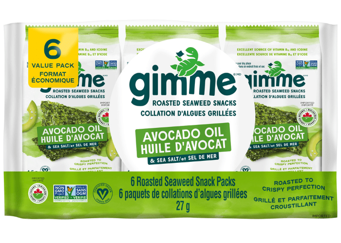 Description : Idée de collation originale, ces algues grillées au sel marin et à l'huile d'avocat sont proposées par GimMe. Chez GimMe, les algues sont cultivées dans des eaux protégées sans utilisation de produits chimiques ou de pesticides. Riches en protéines et en fibres, les algues contiennent dix à vingt fois plus de minéraux que n'importe quelle plante terrestre, ce qui en fait l'aliment le plus riche en minéraux.