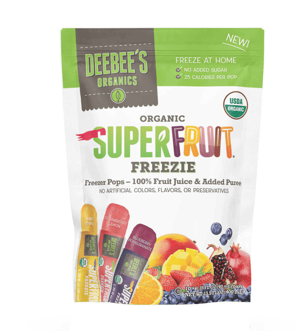 Description: Les SuperFruit Freezies de DeeBee's Organics sont la première barre de jus biologique à congeler à la maison sans sucres ajoutés, arômes artificiels, colorants ou conservateurs. Dans chaque sac, vous obtiendrez trois délicieuses saveurs que toute la famille appréciera: bleuet-grenade, fraise-citron et mangue-orange. Les surgelés SuperFruit de DeeBee's Organics sont également exempts des 8 principaux allergènes - arachides, noix, lait, œufs, poisson, crustacés, soja, fruits de mer et blé!