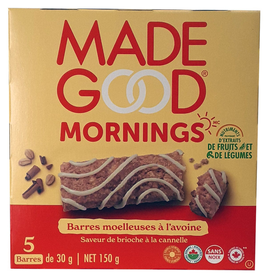 Description : Pour un petit déjeuner réussi, découvrez les barres moelleuses à l'avoine à saveur de brioche à la cannelle de Made Good. Riches en nutriments provenant de fruits et de légumes, ces barres ont l'avantage de ne contenir aucun des principaux allergènes.