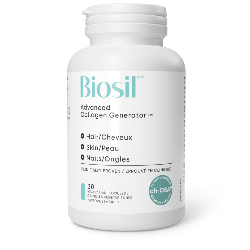 Description : Contribue à la formation du collagène. Soutient la santé des cheveux, de la peau et des ongles. Lorsqu’il s’agit d’obtenir une peau lisse, des cheveux épais et résistants et des ongles solides, le collagène est la protéine structurale déterminante. Pendant la jeunesse, la réserve de collagène est immensément abondante. De plus, il se tisse en une matrice qui forme un « filet serré » et résistant. Cet état idéal du collagène empêche la formation des rides, confère de l’élasticité à la peau et contribue à la densité et à la vigueur de la chevelure. Toutefois, dès l’âge de 21 ans, le taux de collagène diminue de 1 % par an. C’est à ce moment que le « filet » vital de collagène commence à se relâcher. Dès 30 ans, les signes du déclin du collagène commencent à se manifester sur la peau, les cheveux et les ongles. Lorsqu’il s’agit de concrétiser la régénération du collagène, l’efficacité de l’acide orthosilicique stabilisé par la choline (ch-OSA) contenu dans BioSil est démontrée en clinique. BioSil active les véritables cellules productrices du collagène, soit les fibroblastes. En effet, ce produit a été soumis à de rigoureux essais à double insu comparatifs avec placebo, et ce, tant en matière d’innocuité que d’efficacité.