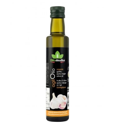 Description : Idéalement utilisée crue, l'huile d'olive extra vierge à l'ail de Bioitalia vous permettra de rehausser la saveur de vos plats. Cette huile d'olive parfumée est préparée à partir d'ail frais et d'ingrédients exclusivement biologiques.