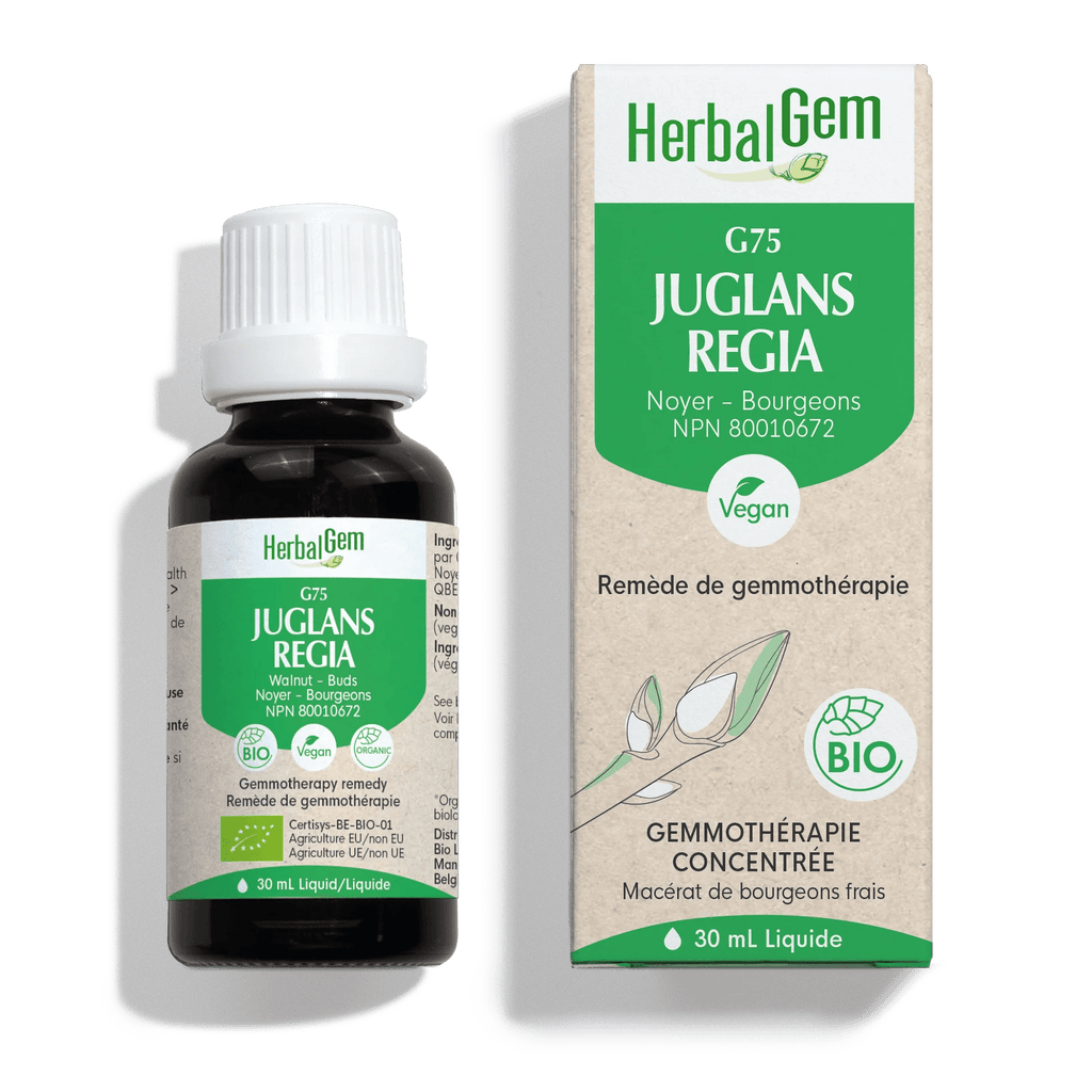 Ingrédients : Juglans regia 0,05 ml (bourgeons de noyer) (extrait 1:20, QCE 2,5 mg), glycérine bio (végétale), alcool bio, eau purifiée.