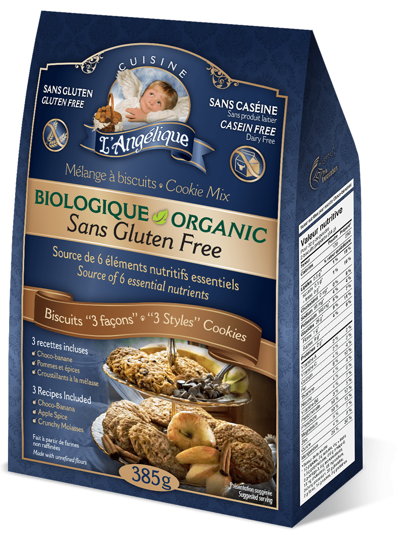 Description : Un ensemble de 3 recettes de biscuits sans gluten délicieux. Vous n'aurez plus besoin de choisir, voici que vous pourrez avoir un choco-banane, un pommes-épice et un croustillant à la mélasse comme dessert! Fabriqué dans un environnement SANS : blé et gluten, produits laitiers, arachide, noix, soja, maïs, pomme de terre et sésame.