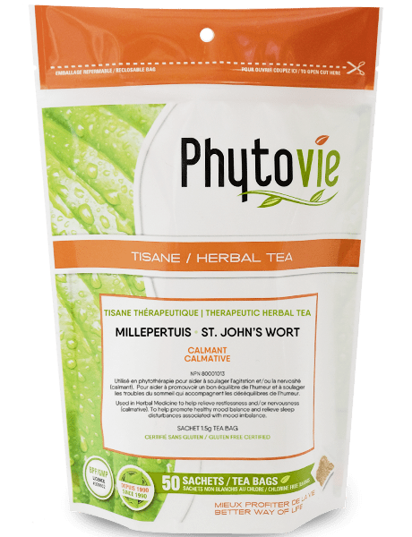 Description : Utilisé en phytothérapie pour aider à soulager l’agitation et/ou la nervosité (calmant). Pour aider à promouvoir un bon équilibre de l’humeur et à soulager les troubles du sommeil qui accompagnent les déséquilibres de l’humeur. Ingrédient : Chaque sachet contient 1.5g partie aérienne séchée d’hypericum perforatum (millepertuis). Mode d’emploi : 1 sachet, 2 fois par jour, en infusion. Infuser 1 sachet dans 1 tasse d’eau bouillante pendant 10 à 15 minutes.