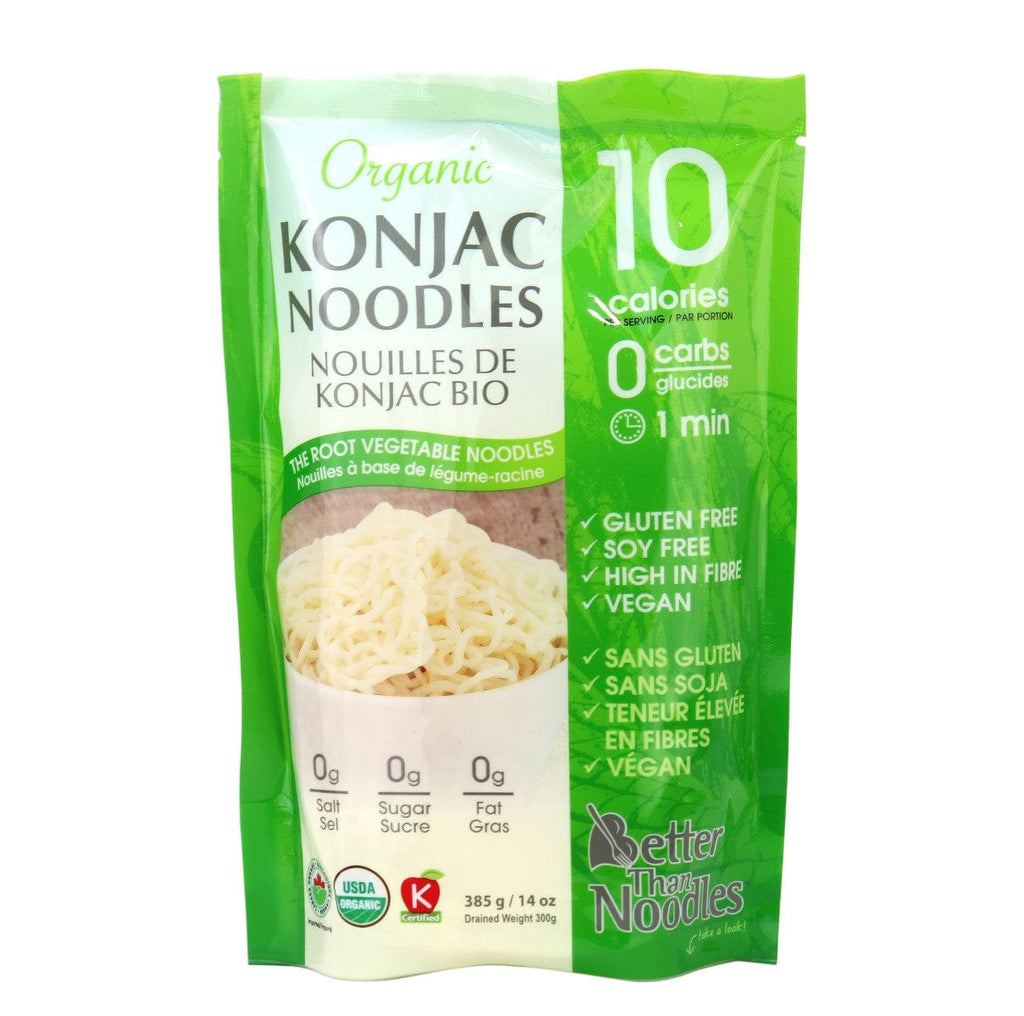 Description: Les nouilles konjac biologiques Better Than Noodles sont à base de légumes-racines, sans gluten, sans soja, riches en fibres et végétaliennes. Le konjac est un légume racine consommé au Japon depuis des siècles. Il est riche en fibres, avec une faible teneur en calories. Une excellente alternative aux nouilles traditionnelles. Une fois ouvertes, les nouilles peuvent être conservées jusqu'à 48 heures dans un bol d'eau. Ne congelez pas. Le produit peut avoir une légère odeur qui sera complètement éliminée lors du rinçage.