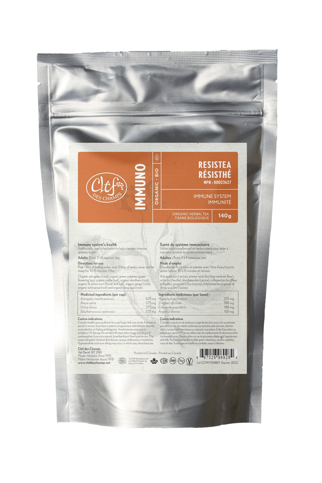 Ingrédients : Astragale bio, avoine bio, ortie bio, éleuthéro bio, millepertuis bio, gingembre bio, echinacea bio, dong quai bio.
