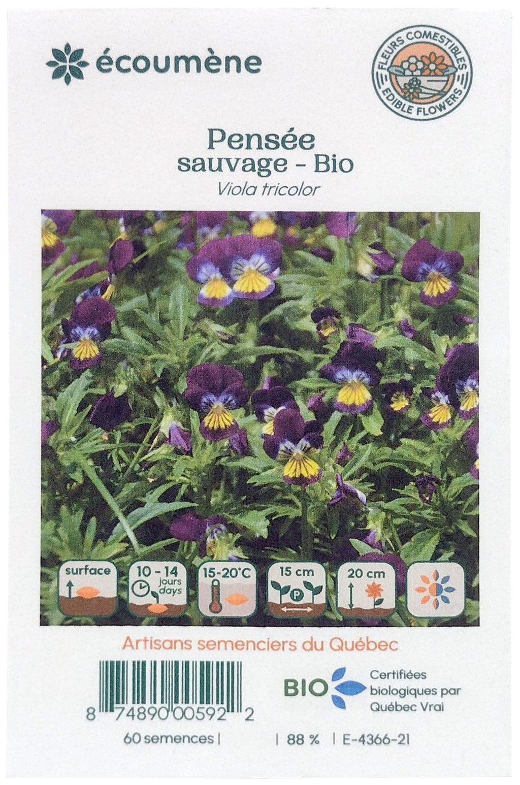 Description : Les jolies fleurs bleu-violet à œil jaune de cette pensée indigène sont merveilleuses pour décorer et pour aromatiser salades, gâteaux, soupes froides, tisanes, et plus encore. En plus des fleurs, les feuilles de la pensée sauvage entrent elles aussi dans la préparation de salades auxquelles elles donnent un bon goût poivré. Le plant rustique jusqu’en zone 3 se cultive au soleil ou à l’ombre légère, mais sa floraison est plus abondante au soleil.